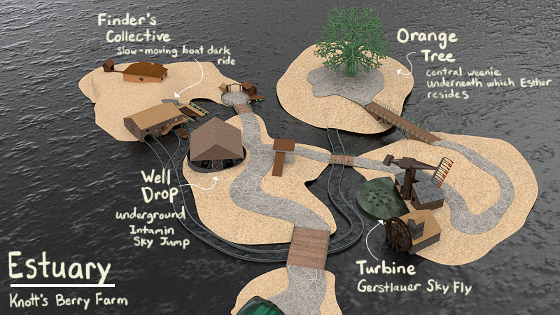 Concept Inspiration: Finding many theme parks creating magic through their own natural beauty (e.g. Toverland and Efteling), I recognized the parallels to Knott’s Berry Farm’s culturally and ecologically inspired lands, from the mountains of Camp Snoopy to the waves of Boardwalk. I found, however, there was one prominent biome missing: the wetland. Much of Orange County was marsh before turning into fertile orange groves and today suburban sprawl. I found it both important to tie Knott’s and its Orange County visitors back to the ecosystem it has since been paved over.